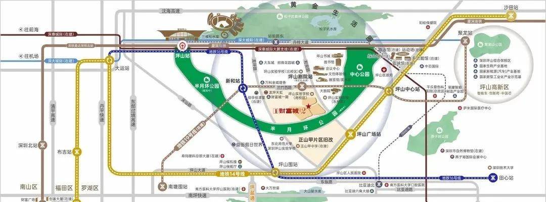 ·家门口三地铁环绕:14/16/19号线(在建),坪山广场站、新和站、坪山剧院站(在建)三站环绕,快线站直达岗厦北,便捷换乘畅达各区核心;
